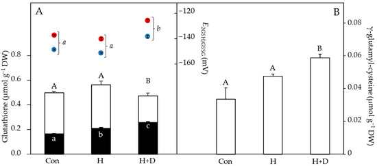 LMW thiol and disulphide concentrations, normalised to sample dry weight (DW), and cellular glutathione redox potential (EGSSG/2GSH) of leaves in response to heat hardening. Plants were exposed to increased heat (H) or to increased heat and drought (H+D), and leaves taken for analysis after 8 d of heat hardening, or from non-heat-hardened plants (Con). (A) The stacked bar chart shows GSH (white bars) and GSSG (black bars), with EGSSG/2GSH values above (right y axis), considering daytime (38 °C, red) or night-time (10 °C, blue) temperatures (see methods). (B) γ-glutamyl-cysteine concentrations. Significant differences (p < 0.05) are denoted by different capital, lower-case and lower-case italic letters for thiols, GSSG and EGSSG/2GSH, respectively, n = 4 ± SD.