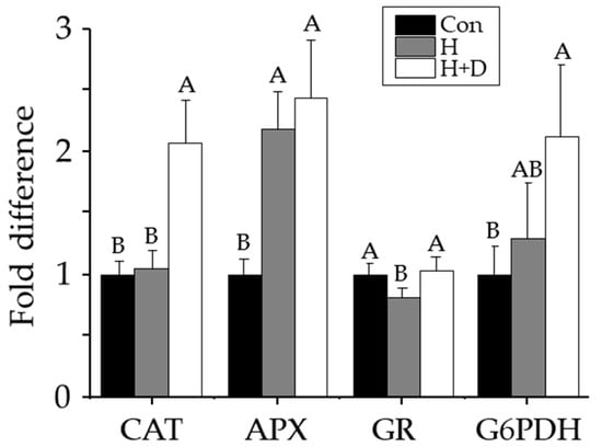 Non-heat-hardened plants had catalase, ascorbate peroxidase, glutathione reductase and G6PDH activities of 6.0 ± 0.6, 12.6 ± 1.5, 0.40 ± 0.03 and 0.03 ± 0.01 µkat mg−1 protein, respectively. Ascorbate peroxidase activity was 2.2-fold higher in H leaves, and 2.4-fold higher H+D leaves, compared to non-heat-hardened plants (Figure 5). Catalase and G6PDH activities were two-fold higher in H+D leaves, but insignificantly different in H leaves, compared with non-heat-hardened plants (Figure 5). Glutathione reductase activity was significantly higher in H+D leaves compared with H leaves, but after H+D, they were indifferent to the activity in non-heat-hardened plants (Figure 5).