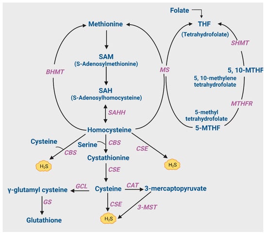 - Ji, D.; Luo, C.; Liu, J.; Cao, Y.; Wu, J.; Yan, W.; Xue, K.; Chai, J.; Zhu, X.; Wu, Y.; et al. Insufficient S-Sulfhydration of Methylenetetrahydrofolate Reductase Contributes to the Progress of Hyperhomocysteinemia. Antioxid. Redox Signal. 2022, 36, 1–14. [Google Scholar] [CrossRef]