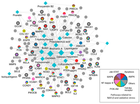 A compound-target network of SC. Circles and diamonds denote protein targets and compounds, respectively. The circle edge and body color indicate targets and signaling pathways relate to oxidative stress and NAFLD, respectively. Edges denote interactions between the compound and target.