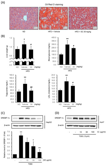 Effect of SC on high fat diet-induced fat accumulation in vivo and SREBP-1c expression in vitro. (A) Representative mouse liver images from each group with Oil Red O staining (scale bar represents 100 μm). Mice were fed a ND or a HFD for 9 weeks according to their respective groups. SC was administered orally at a dose of 30 mg/kg three times per week for 4 weeks, along with each respective diet. (B) Liver weight, blood markers of diabetes, including fasting blood glucose, and blood markers of hyperlipidemia, including triglycerides and LDL-cholesterol. The differences in Liver weight, fasting blood glucose, triglycerides, and LDL cholesterol were represented as statistical significance compared to the ND-fed group (* p < 0.05, ** p < 0.01) and the HFD-fed group (# p < 0.05, ## p < 0.01). Immunoblotting analysis of HepG2 cell (C) and Huh-7 cell (D) lysates for SREBP-1c protein. HepG2 and Huh7 cells were pre-treated with SC at concentrations of 10, 30, and 100 μg/mL for 1 h prior to incubation with T090 (10 μM) for 12 h.
