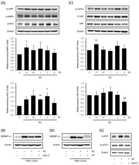 Effect of SC on activation of AMPK signaling pathway and Hippo-YAP signaling pathway. Immunoblotting analysis of key proteins in the AMPK pathway (A) and Hippo-YAP pathway (C). HepG2 cells were cultured in serum-free media for 12 h, followed by treatment with 100 μg/mL of SC for the indicated time period. Key proteins in each pathway, p-AMPK, p-ACC, p-YAP, and YAP, were tested in at least three replicates. Results were expressed as the mean ± SD, and statistical significance was indicated as * p < 0.05, ** p < 0.01 when comparing control and SC-treated cells. (B) Differences in SREBP-1c expression by Compound C: an AMPK inhibitor. HepG2 cells were treated with 10 μM Compound C for 30 min prior to treatment with 100 μg/mL SC for 1 h, followed by treatment with T090 (10 μM) for 12 h. (D) Changes in SREBP-1c expression by the YAP inhibitor, VP. HepG2 cells were treated with 0.6 μM VP for 30 min prior to treatment with 100 μg/mL SC for 1 h, followed by treatment with T090 (10 μM) for 12 h. (E) Expression of p-LATS1, a key protein in the Hippo-YAP pathway, by AMPK inhibition. HepG2 cells were treated with 10 μM Compound C for 30 min, followed by treatment with 100 μg/mL SC for 30 min.