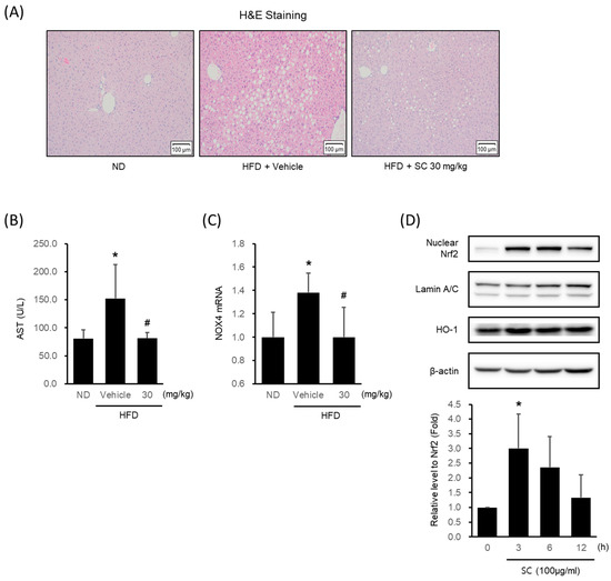 Effect of SC on high fat diet-induced hepatic injury in vivo and antioxidant-related proteins in vitro. (A) H&E images of liver tissue from a representative mouse in each group (scale bar represents 100 μm). Mice were fed as described in Figure 2A. (B) Blood markers of liver injury. The levels of aspartate aminotransferase were measured in the blood serum of mice from the respective group. (C) mRNA expression of NOX4 in liver tissue. The extracted mRNA from mouse livers in the respective groups was analyzed by quantitative real-time PCR. Statistical significance of aspartate aminotransferase levels in plasma and NOX4 mRNA levels in liver tissue was indicated by comparison with the ND-fed group (* p < 0.05) and HFD-fed group (# p < 0.05). (D) Immunoblotting analysis of Nrf2 in HepG2 cell nucleus. HepG2 cells were incubated in a serum-free media for 12 h, followed by treatment with 100 μg/mL of SC for 3, 6, and 12 h. Lamin A/C are loading controls of nucleus proteins for immunoblotting analysis. (D) Immunoblotting analysis of the expression HO-1 by SC. HepG2 cells proceeded as described in Figure 4D.