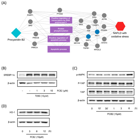 We further investigated the hepatoprotective effects of SC ingredients. Among the prioritized active compounds, we focused on Procyanidin B2, as this is not only a potential quality marker for SC but was also easily detectable by chromatography technique [33,34]. We first investigated the multiscale-level mechanisms of procyanidin B2 against NAFLD with oxidative stress. We constructed a subgraph comprising the most frequently visited nodes in the diffusion profile of procyanidin B2 and NAFLD with oxidative stress (Figure 5A). The constructed network suggested that procyanidin B2 directly interacted with the protein PTGS2, which could be associated with NAFLD and liver oxidative damage. Additionally, we found that the protein targets of procyanidin B2 closely interacted with the biological functions related to transcription and apoptosis, as well as proteins related to the AMPK signaling pathway. These findings suggest the potential mechanisms of procyanidin B2 in mitigating NAFLD with oxidative stress. To gain a deeper understanding of the component’s effects on NAFLD, we utilized subsequent experiments to evaluate the effects of procyanidin B2. We found that procyanidin B2 inhibited lipogenesis and modulated related signaling pathways in vivo. These results showed that procyanidin B2 suppressed the T090-induced expression of SREBP-1c in a concentration-dependent manner (Figure 5B). We also found that procyanidin B2 increased the phosphorylation of AMPK and YAP (Figure 5C) and enhanced the expression of HO-1 (Figure 5D). In summary, our findings suggest that procyanidin B2, a potential quality marker for SC, played a crucial role in mitigating NAFLD with oxidative stress by modulating key proteins and signaling pathways, such as AMPK and YAP.