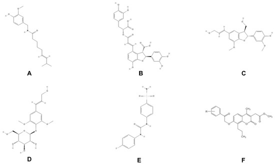 Two-dimensional structure of (A) Capsaicin, (B) Lithospermic acid, (C) (-)-Dehydrodiconiferyl alcohol, (D) Syringin, and (E) SLC-0111, as example of sulfonamide-based inhibitors, and (F) Coumarin derivative.