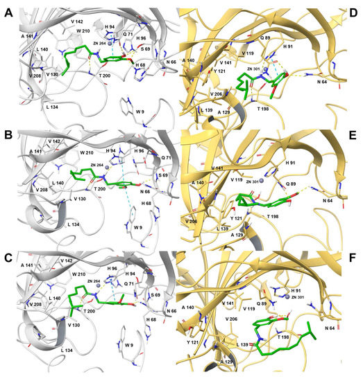 Three-dimensional representation of the Capsaicin complexed with (A–C) hCA IX and (D–F) hCA XII. The ligands are depicted as green sticks, the zinc ion as a grey sphere and the amino acid residues involved in the most relevant contacts with ligands as gray and yellow sticks. Conversely, hCA IX and hCA XII are depicted as grey and yellow cartoons, respectively. H-bonds and stacking interactions are shown as yellow and cyan dash lines, respectively.