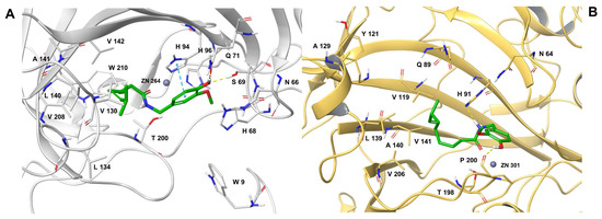 Three-dimensional representation of the most populated cluster of Capsaicin complexed with (A) hCA IX and (B) hCA XII. The ligands are depicted as green sticks, the zinc ion as a grey sphere, and the amino acid residues involved in the most relevant contacts with ligands as gray and yellow sticks. Conversely, hCA IX and hCA XII are depicted as grey and yellow cartoons, respectively. H-bonds and stacking interactions are shown as yellow and cyan dash lines, respectively.