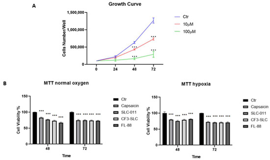 The pictures show the in vitro inhibitory effects of capsaicin in the A549 cell model: (A) dose-dependent growth curve of A549 cells treated with different concentrations of Capsaicin 0.1 μM (not shown), 1 μM (not shown), 10 μM and 100 μM for 24 h, 48 h and 72 h. Cells were counted in Burker’s chamber, using the Trypan Blue. (B) MTT assay was performed to determine cell viability and cytotoxicity after 48 h and 72 h treatment with Capsaicin [10 µM], in parallel with SLC-0111, CF3-SLC, and FL-88 [10 µM], well-known hCA XI and hCA XII inhibitors. *** p < 0.001.