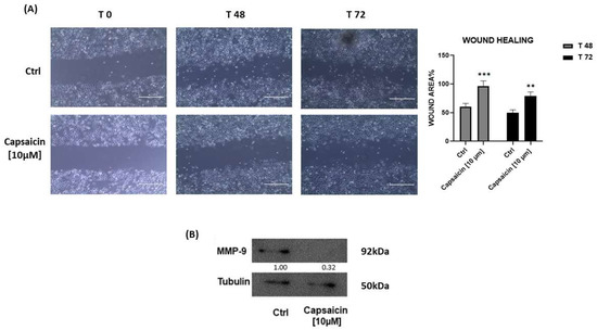 (A) Optical microscopy images of wound healing assay on A549 cells, untreated vs. Capsaicin [10 µM] samples acquired at different time points of 0, 24 h (not shown), 48 h, and 72 h. (B) Representative Western Blot of MMP-9 from protein extracted by A459 cells culture. β-Tubulin was used for normalization control. In both conducted experiments, densitometry analysis was elaborated using ImageJ Software. ** p < 0.01 and *** p < 0.001.