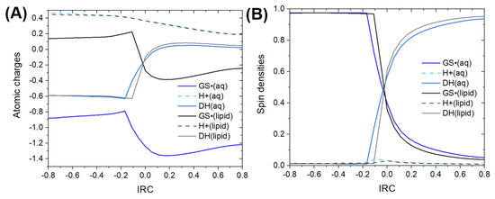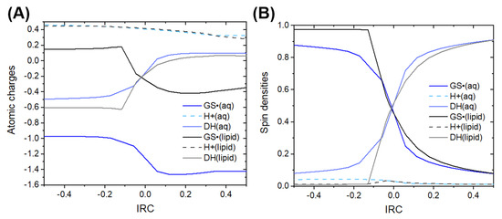 Evolution graphics of (A) NPA atomic charges and (B) Hirshfeld spin densities for the PCET reaction between GS• radical and catechol (DH) as functions of the IRC in aqueous (blue) and lipid (black) medium.