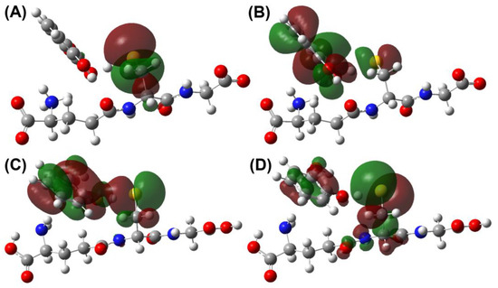Density surfaces at the transition state geometry for the molecular orbitals for the PCET reaction between the GS• radical and catechol: (A) SOMO and (B) HOMO in aqueous medium; (C) SOMO and (D) HOMO in lipid medium. Computed with an isodensity value of 0.02 a.u.