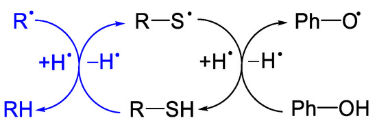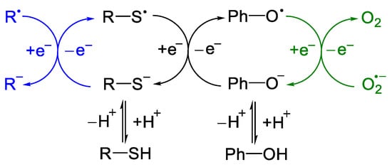 In this context, the possibility arises that a thiol-type antioxidant may be regenerated by phenolic-type antioxidants, known to act via SPLET mechanism in aqueous media [48,49,50,51,52] and by their ability to be repaired by O2•− under physiological conditions [43,44,45]. This way, a synergistic cycle would be generated, in which a thiol sacrifices itself to repair damaged biomolecules. Then, it is repaired by a phenol, which, in due time, is regenerated by the superoxide radical anion.