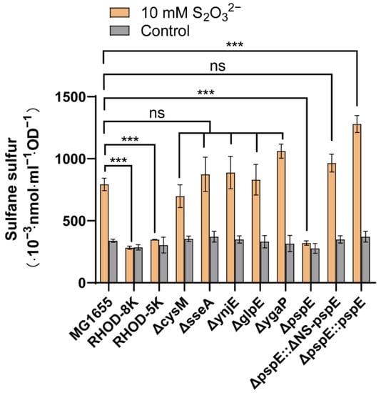 Cellular sulfane sulfur of the E. coli MG1655 wild type and RHOD deletion mutants with or without thiosulfate. The E. coli MG1655 wild type, mutants, and pspE-overexpressed strain were cultured until an OD600nm of 1.0 and then incubated with or without 10 mM thiosulfate for 1 h. The cellular sulfane sulfur reacted with sulfite to produce thiosulfate, which was detected. Three parallel experiments were performed to obtain the averages and standard deviations (n = 3). The T-test method was performed to calculate the p-values (ns, p ≥ 0.05; ***, p < 0.001).