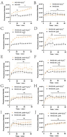 Sulfane sulfur detection using SSP4 during incubation of E. coli with thiosulfate. Eight genes encoding RHODs were cloned from the MG1655 wild-type genome, which was ligated with the pBBR1MCS2 plasmid using the T5 exonuclease-dependent assembly method. Plasmids were Ittransformed into RHOD-8K competent cells to produce (C) RHOD-8K::pspE, (D) RHOD-8K::glpE, (E) RHOD-8K::sseA, (F) RHOD-8K::ynjE, (G) RHOD-8K::ygaP, (H) RHOD-8K::yceA, (I) RHOD-8K::ybbB, and (J) RHOD-8K::yibN with (A) MG1655 and (B) RHOD-8K as control. The sulfane sulfur content in cells were monitered by using SSP4 staining method in these strains. In brief, the strains were cultured until an OD600nm of 1.0. The cells were harvested and resuspended in PBS buffer at an OD600nm of 0.5. Then, 10 mM thiosulfate was added to the cell, and the control did not receive thiosulfate. After adding 0.5 mM CTAB and 20 μM SSP4, fluorescence was detected using a microplate reader at 37 °C every 5 min for 1 h. CTAB was added to permeabilize the cell membrane. Three parallel experiments were performed to obtain the averages and standard deviations (n = 3). The T-test method was performed to calculate the p-values (ns, p ≥ 0.05; *, p < 0.05; **, p < 0.01; ***, p < 0.001). The subfigures (A–J) are used to represent the sulfane sulfur detected in MG1655, RHOD-8K, RHOD-8K::pspE, RHOD-8K::glpE, RHOD-8K::sseA, RHOD-8K::ynjE, RHOD-8K::ygaP, RHOD-8K::yceA, RHOD-8K::ybbB, and RHOD-8K::yibN, respectively.