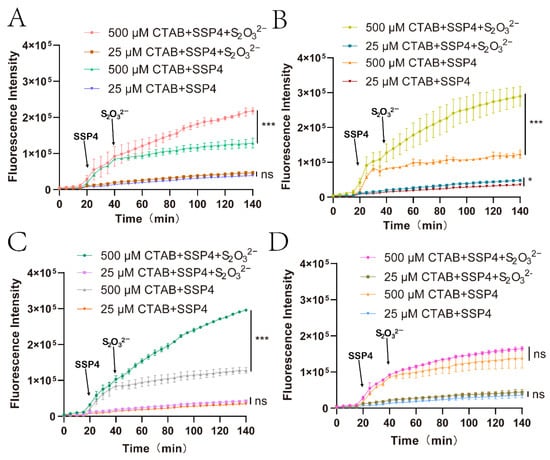 Intracellular and extracellular sulfane sulfur was continuously monitored using SSP4. (A) MG1655, (B) ΔpspE::pspE, (C) ΔpspE::ΔNS-pspE, and (D) ΔpspE cells were harvested and resuspended in PBS at an OD600nm of 2.0. An amount of 200 μL of resting cells was transferred to a black 96-well plate with 500 μM or 25 μM CTAB and incubated at 37 °C with shaking. Then, 20 μM SSP4 was added after 20 min, and 10 mM thiosulfate was added after 40 min. The excitation wavelength (Ex) and emission wavelength (Em) at 482 nm and 515 nm were continuously detected every 5 min for 2.3 h. Three parallel experiments were performed to obtain the averages and standard deviations (n = 3). The T-test method was performed to calculate the p-values (ns, p ≥ 0.05; *, p < 0.05; ***, p < 0.001).