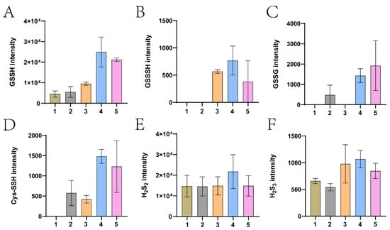 LC-MS analysis of cellular sulfane sulfur species in E. coli. The E. coli strains were cultured until an OD600nm of 1.0 before being harvested and resuspended in PBS. Resting cells at an OD600nm of 2.0 were incubated with 10 mM thiosulfate for 1 h, and then harvested. Cellular sulfane sulfur species were analyzed using LC-MS. (A) GSSH, (B) GSSSH, (C) GSSG, (D) Cys-SSH, (E) H2S2, and (F) H2S3 were detected. 1, the control MG1655 without thiosulfate; 2, ΔpspE + thiosulfate; 3, MG1655 + thiosulfate; 4, ΔpspE::pspE + thiosulfate; 5, ΔpspE::ΔNS-pspE + thiosulfate. Two parallel experiments were performed, with averages and ranges being presented.