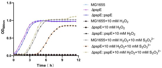 H2O2 inhibits the growth of E. coli cells [59]. We tested the growth of the E. coli MG1655 wild type, ΔpspE, and ΔpspE::pspE in LB medium. It was found that 10 mM H2O2 completely inhibited the growth of the E. coli strains (Figure 5). When 2 mM thiosulfate was added, the wild type and ΔpspE::pspE had a 6 h lag time and 7 h lag time, respectively, but the pspE mutant did not grow (Figure S7). With 10 mM thiosulfate, the MG1655 wild type and ΔpspE::pspE grew after a 2 h lag time, but the pspE deletion strain grew after a 4.5 h lag time and grew at a slower rate than the other two strains (Figure 5).