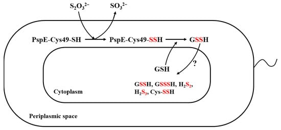 The proposed conversion of thiosulfate to cellular sulfane sulfur in E. coli. PspE converts thiosulfate to GSSH in the periplasmic space, which is then transported into the cytoplasm via an unknown mechanism. The detected cellular sulfane sulfur species include GSSH, GSSSH, H2S2, H2S3, and Cys-SSH.