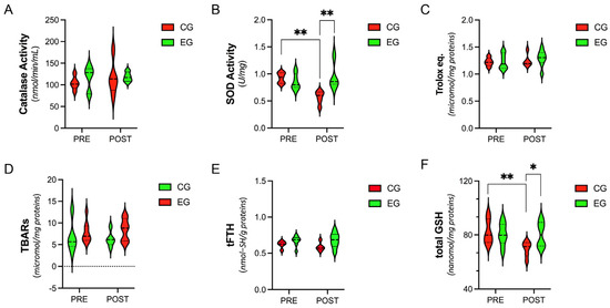 Violin−plot analysis comparing the plasma antioxidants and oxidative−stress markers measured at baseline (PRE) and at the end of the experimental period (POST) in female breast cancer patients assigned either to the Control Group (CG, n = 10), where all subjects received the usual cancer treatments, or to the Exercise Group (EG, n = 10), where they were additionally included in a 16−week online exercise training program. (A) Catalase and (B) SOD activity, (C) TAC and (D) TBARs assays, (E) tFTHs, and (F) total GSH levels. Statistical significance was determined using two−way ANOVA with Bonferroni’s post hoc analysis. * p < 0.05; ** p < 0.01. SOD, superoxide dismutase; TAC, total antioxidant capacity; TBARs, thiobarbituric acid-reactive substances; tFTHs, total free thiols; GSH, glutathione.