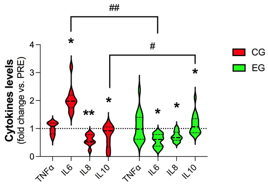 Violin-plot analysis comparing the plasma concentrations of TNFα, IL6, IL8, and IL10 measured at the baseline (PRE) and at the end of the experimental period (POST) in female breast cancer patients assigned either to the Control Group (CG, n = 10), where all subjects received the usual cancer treatments, or to the Exercise Group (EG, n = 10), where they were additionally included in a 16-week online exercise training program. Statistical significance was determined using two-way ANOVA with Bonferroni’s post hoc analysis. Each violin plot shows the fold changes relative to baseline levels. * p < 0.05, ** p < 0.01, # p < 0.05; ## p < 0.01.