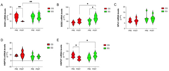 Violin-plot analysis comparing the mRNA levels of heat-shock proteins and antioxidants such as SOD1 (A), SOD2 (B), GPx1 (C), HSP70 (D), and HSP27 (E) in PBMCs isolated at the baseline (PRE) and at the end of the experimental period (POST) from female breast cancer patients assigned either to the Control Group (CG, n = 10), where all subjects received the usual cancer treatments, or to the Exercise Group (EG, n = 10), where they were additionally included in a 16-week online exercise training program. Statistical significance was determined using two-way ANOVA with Bonferroni’s post hoc analysis. * p < 0.05; ** p < 0.01. CG, Control Group; EG, Exercise Group; SOD, superoxide dismutase; GPx, glutathione peroxidase; HSP, heat-shock protein.
