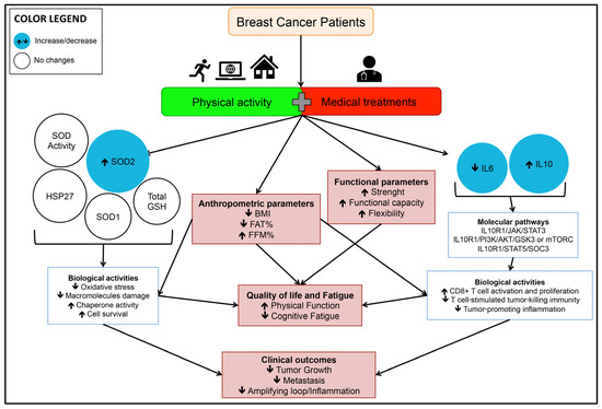 Over the past decades, physical activity (PA) has emerged as an integrative therapy to improve cancer survival outcomes, and international guidelines include regular PA as a recommendation for patients [9]. In women with BC, PA during adjuvant therapy has been shown to reduce loss of muscle strength [10], improve health-related quality of life (QoL), and reduce cancer-related fatigue as well as other negative side effects of treatments [11,12,13]. Some of these improvements may be related to the capacity of PA to counteract the negative effects of BC treatments on systemic redox homeostasis. Despite the documented benefits of PA, a decrease in PA is very often observed after BC diagnosis, and a large proportion of BC survivors do not reach the recommended levels of PA, suggesting that targeted intervention is necessary within this population [14].