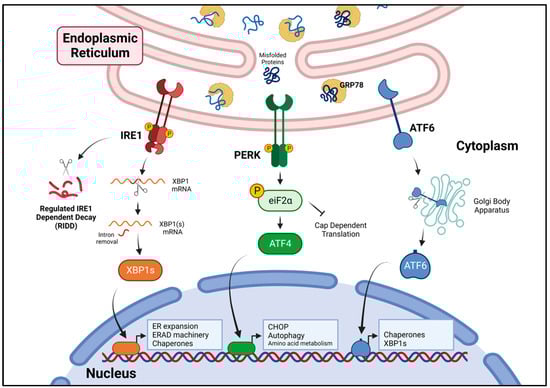 While the ER has defense strategies, if ROS levels exceed the buffering capacity of ROS scavengers, ER function becomes impeded. Increased ROS can result in excess oxidation or hyperoxidation of ER-resident proteins, altering their conformation and function. For example, PRDX4 can be irreversibly inactivated through overoxidization into its sulfonic acid form (-SO3H) under high H2O2 levels [23,24]. Furthermore, perturbances within ER redox homeostasis disrupt the conditions required to support disulfide bond formation, thus negatively affecting protein folding [25]. This can result in the buildup of misfolded or unfolded proteins within the ER lumen, a state commonly referred to as ER stress. To combat ER stress, cells trigger the activation of the UPR. The UPR aims to restore ER homeostasis by promoting the folding of proteins that can be refolded, while initiating the degradation of those beyond repair via a process referred to as ER-associated degradation (ERAD). The UPR and its constituent signaling pathways have been well characterised over the past few decades.