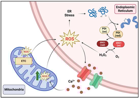 Figure 2. Both the endoplasmic reticulum and mitochondria are major sources of cellular ROS. If ROS levels increase, Ca2+ release by the ER occurs and can stimulate further ROS production in the mitochondria. This in turn contributes to further ER stress and oxidative stress in the ER. A vicious feedback loop occurs where ER stress aggravates oxidative stress and vice versa. Created with BioRender.com.