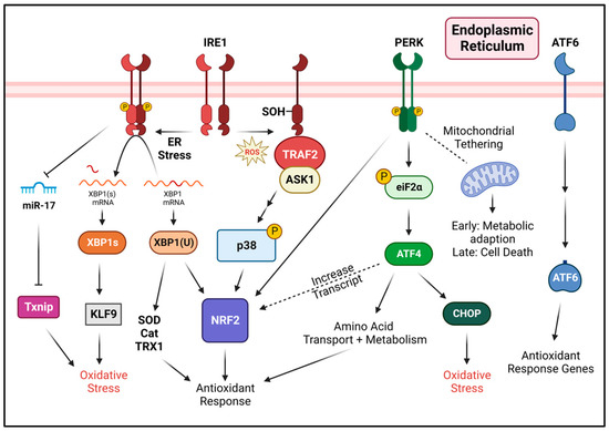 Figure 3. The three UPR signaling pathways (IRE1, PERK and ATF6) and their contribution to both antioxidant signaling and oxidative stress. Created with BioRender.com.