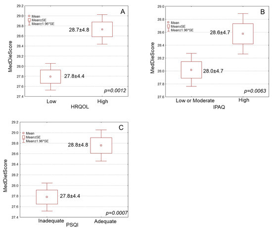 Using MD adherence as continuous variable, older adults with high HRQOL had a significantly higher mean MedDietScore than those with low HRQOL (Figure 1A, 28.7 ± 4.8 vs. 27.8 ± 4.4). Participants with high physical activity levels had a considerably greater mean MedDietScore than those with low or moderate physical activity levels (Figure 1B, 28.6 ± 4.7 vs. 28.0 ± 4.7). Participating individuals with adequate sleep quality had a significantly higher mean MedDietScore than those with inadequate sleep quality (Figure 1C, 28.8 ± 4.8 vs. 27.8 ± 4.4).