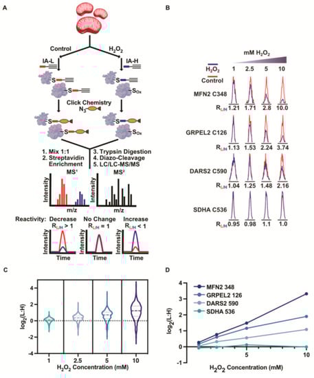 Upon confirming this mitochondrial enrichment, we applied the isoTOP-ABPP platform to rank the mitochondrial cysteines by their sensitivity to hydrogen peroxide (Figure 1A) [47,48]. IsoTOP-ABPP compared the cysteine reactivity across two biological samples through the application of isotopically labeled IA probes, IA-L (light), and IA-H (heavy) (Figure S2A). The Mito-P fractions were treated with 1, 2.5, 5, and 10 mM of hydrogen peroxide for 20 min. These peroxide-treated samples were then labeled with IA-H, and a corresponding untreated control sample was labeled with IA-L. The peroxide-treated and untreated samples were mixed together prior to the streptavidin enrichment, trypsin digestion, and sodium dithionite elution. The resulting peptide mixtures were analyzed using LC/LC-MS/MS. For every cysteine-containing peptide that was identified, the relative IA-labeling in the untreated controls versus the peroxide-treated experimental samples could be determined by the light:heavy (L:H) ratios. An L:H ratio of >1 corresponded to a decrease in the cysteine reactivity upon the peroxide treatment, and was indicative of cysteine oxidation. An L:H ratio equivalent to 1 indicated an unchanged cysteine reactivity upon the peroxide treatment. Importantly, the use of this isoTOP-ABPP analysis allowed for a determination of the extent of oxidation, whereby the higher the L:H ratio value, the greater the stoichiometry of the oxidation. The peroxide concentrations used were supraphysiological, but were selected such that minimal oxidation was observed at the lowest concentration (1 mM) and a high-stoichiometry oxidation for a subset of cysteines was present at the highest peroxide concentration (10 mM). Importantly, we ensured that, at the highest (10 mM) concentration of peroxide, we did not see the complete oxidation of all the cysteines, indicating that we were not completely overwhelming the oxidation capacity of the system.