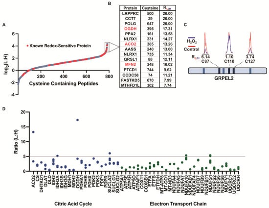 Our data confirm that cysteines within a single protein can display widely divergent redox sensitivities. For instance, we identified three cysteines on GRPEL2 with varying redox sensitivities (Figure 2C). In the presence of the peroxide, the reactivity of C110 was preserved (an L:H ratio of 1.1), while C87 and C127 displayed L:H ratios of 6.1 and 3.7, respectively. The most redox-sensitive cysteine, C87, is known to facilitate a GRPEL2 dimer formation that protects against proteolysis during oxidative stress [61]. The identification of well-characterized sites of cysteine oxidation serves to validate the ability of our platform to accurately report on the redox sensitivities of mitochondrial cysteines.