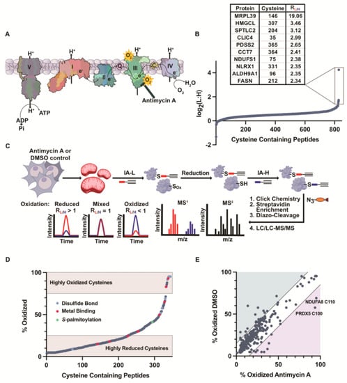 The analysis using isoTOP-ABPP was performed according to Weerapana, E. et al. [48], Bak, D. et al. [42], and Abo, M. et al. [47]. For the hydrogen peroxide treatments, 0.5 mg of isolated Mito-P lysates in 500 µL were pretreated in the dark with 1 µL of 100× stocks of hydrogen peroxide or water on ice, for 20 min prior to the IA labeling. For the Antimycin A studies, the IA labeling was performed on 0.5 mg of intact Mito-P fractions prior to lysis.