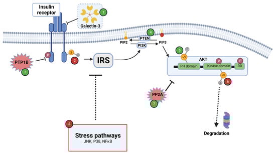Redox regulation of insulin signaling in target tissues of insulin action (i.e., muscle, adipose tissue and liver). ROS exert positive and negative effects on insulin signaling. Stimulatory events are marked in green numbers, while inhibitory events are marked in red numbers. ROS-dependent stimulatory mechanisms: The inhibitory effect of Galectin-3 on insulin receptor is prevented upon glutathionylation of the lectin (1). PTP1B is inhibited by oxidation of critical thiols located in catalytic area, enabling stimulation of insulin signaling (3). PTEN is inhibited by oxidation, thus abolishing PIP3 dephosphorylation (4). Oxidation of thiol residue in the PH domain of Akt enhances its binding affinity to PIP3 (5). Oxidation of PTP2A diminishes its activity, thus preserving phosphorylation and activation of Akt (7). ROS-dependent inhibitory mechanisms: Oxidation of thiol groups (Cys1245–Cys1308) located on the intracellular domain of insulin receptor abrogates ATP binding and receptor activation (2). Proteasomal degradation of Akt is stimulated upon oxidation of Cys in kinase domain (6). ROS might activate stress pathways such as Jnk and p38, leading to an increase in IRS serine phosphorylation, associated with insulin resistance (8). See details in text. Created with BioRender.com (accessed on 5 March 2023).