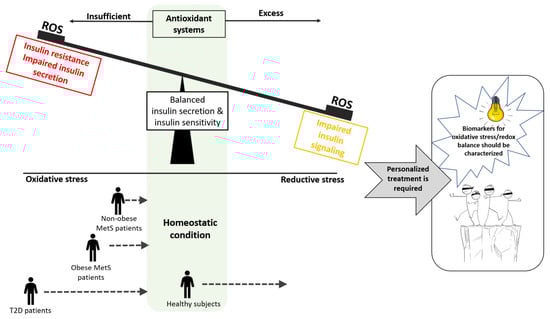 Inappropriate dosing of AOXs may contribute to the failure of these agents in clinical studies. Homeostatic redox balance is required to preserve an optimal insulin secretion and insulin sensitivity. Insufficient AOX activity leads to oxidative stress that promotes development of T2D. It is assumed that elevating severities of oxidative stress is presented in patients with MetS, obesity and overt T2D. AOX dose should be adapted to severity of oxidative stress. On the other hand, excess AOXs might deplete ROS, leading to a reductive stress, which was shown to impair insulin signaling. Therefore, AOX supplementations given as a preventive strategy to a healthy subject might lead to adverse outcomes. Biomarkers for accurate measurement of oxidative stress should be developed to optimize AOX benefits.