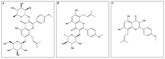 Major active compounds (flavonoids) found in EP. (A) ICA; (B) ICS II; (C) ICT.