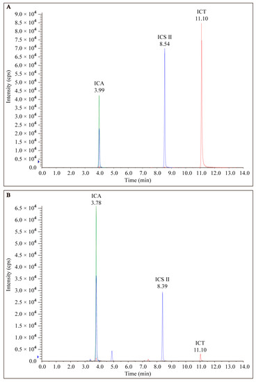 EP was prepared from dried roots of Epimedium and analyzed via LC-MS/MS as described above. The chromatograms of EP from LC-MS/MS analyses exhibited several prominent peaks as well as many minor peaks (Figure 2). Among the peaks detected, both ICA, ICS II, and ICT were found to be the major constituents of EP.