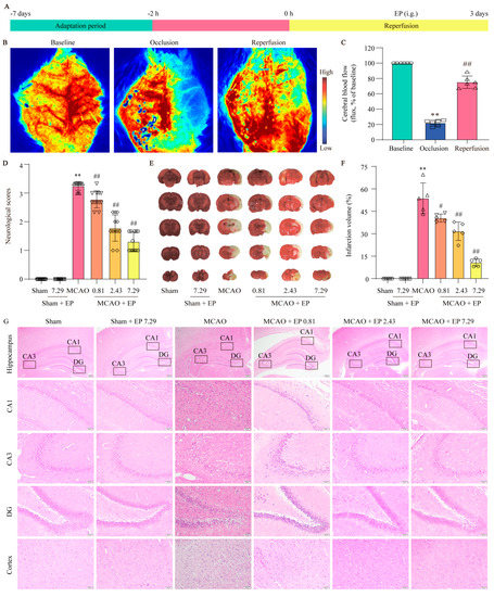 EP protects brain tissue against the damage induced by CIRI. Rats treated with EP (0.81, 2.43, and 7.29 g/kg) for 3 days had improved neurological function and a significant protective effect against brain damage caused by MCAO. (A) Schematic diagram of MCAO−induced rat model treated with EP. (B) Representative laser speckle images. (C) Quantitative analysis of rCBF, ** p < 0.01 versus baseline, ## p < 0.01 versus occlusion, n = 6. (D) Neurological function was assessed by a five-point scale, n = 12. (E,F) Representative images of TTC staining and quantification of infarct volumes 3 days after MCAO, n = 5. (G) H&E staining, n = 5 (×40, ×200; scale bar: 200 μm and 50 μm). Data presented are means ± SD. ** p < 0.01 versus sham group. # p < 0.05, ## p < 0.01 versus MCAO group.