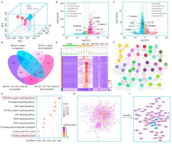 The global gene expression of EA−mediated protection against CIRI by RNA-Seq analysis. (A) PCA. (B) The fold change of DEGs of the MCAO group versus the sham group was summed up using a volcano plot. (C) The fold change of DEGs of the MCAO + EP 7.29 group versus the MCAO group was summed up using a volcano plot. (D) Venn, and (E) Hierarchical heatmap. (F) GO enrichment analysis of DEGs. (G) KEGG pathway analysis of DEGs. (H) The PPI network of DEGs. (I) Core targets in the PPI network.