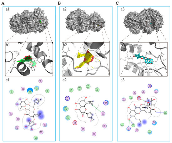 ICA, ICT, and ICS II directly bound to NLRP3. (A) ICA bound to NLRP3. (a1) Two-dimensional interaction map for ICA onto NLRP3 protein binding site. (b1) The entire view of the binding sites between ICA and NLRP3. (c1) A close-up view of the molecular binding pocket. (B) ICT bound to NLRP3. (a2) Two-dimensional interaction map for ICT onto NLRP3 protein binding site. (b2) The entire view of the binding sites between ICT and NLRP3. (c2) A close-up view of the molecular binding pocket. (C) ICS II bound to NLRP3. (a3) Two-dimensional interaction map for ICS II onto NLRP3 protein binding site. (b3) The entire view of the binding sites between ICS II and NLRP3. (c3) A close-up view of the molecular binding pocket.