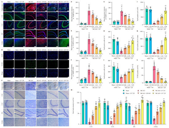 EP protects against CIRI-induced neuronal loss and neuronal death by reducing NLRP3 expression. (A) Representative images of NLRP3 (green) and NeuN (red) expression in the hippocampus and cortex (×40, ×100; scale bar: 500 μm and 200 μm). (B) Representative images of TUNEL staining in the cerebral cortex (×400; scale bar: 50 μm). (C) Nissl staining (×40, ×200; scale bar: 200 μm and 50 μm). (D–G) NLRP3 intensity in the hippocampal CA1, CA3, DG, and cortex regions, n = 5. (H–K) NeuN of cerebral in the hippocampal CA1, CA3, DG, and cortex regions, n = 5. (L) Quantitation of TUNEL positive cells, n = 5. (M) Nissl bodies density level (fold of sham) in the cortex and hippocampal CA1, CA3, and DG regions, n = 5. Data presented are means ± SD. ** p < 0.01 versus sham group. # p < 0.05, ## p < 0.01 versus MCAO group.