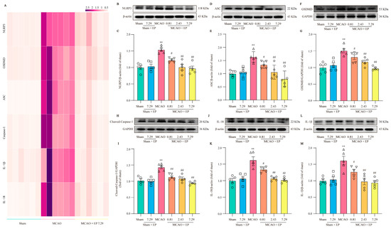 EP down-regulates NLRP3 and its downstream pyroptosis-related genes after CIRI insult. (A) Heatmap of NLRP3 and its downstream pyroptosis-related genes, n = 6. (B) Representative western blots of NLRP3. (C) Quantitation of NLRP3, n = 5. (D) Representative western blots of ASC. (E) Quantitation of ASC, n = 5. (F) Representative western blots of GSDMD. (G) Quantitation of GSDMD, n = 5. (H) Representative western blots of Cleaved-Caspase-1. (I) Quantitation of Cleaved-Caspase 1, n = 5. (J) Representative western blots of IL-18. (K) Quantitation of IL-18, n = 5. (L) Representative western blots of IL-1β. (M) Quantitation of IL-1β, n = 5. Data presented are means ± SEM. ** p < 0.01 versus sham group. # p < 0.05, ## p < 0.01 versus MCAO group.