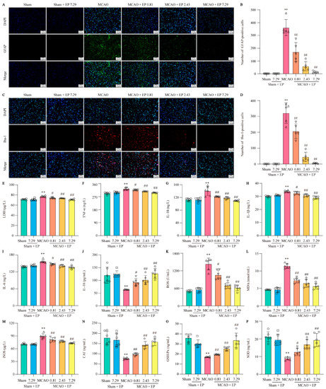 EP decreases the activation of astrocytes and microglia and inhibits neuroinflammation and oxidative stress. (A) Representative images of GFAP expression in cerebral cortex. (B) GFAP-positive cell numbers in cerebral cortex, n = 5. (C) Representative images of Iba-1 expression in cerebral cortex. (D) Iba-1-positive cell numbers in cerebral cortex, n = 5. (E) LDH level, n = 6. (F) TNF-α level, n = 6. (G) IL-18 level, n = 6. (H) IL-1β level, n = 6. (I) IL-6 level, n= 6. (J) IL-10 level, n = 6. (K) ROS level, n = 6. (L) MDA level, n = 6. (M) iNOS level, n = 6. (N) CAT activity, n = 6. (O) GSH-Px activity, n = 6. (P) SOD activity, n = 6. Data were shown as mean ± SD. ** p < 0.01 versus sham group. # p < 0.05, ## p < 0.01 versus MCAO group.