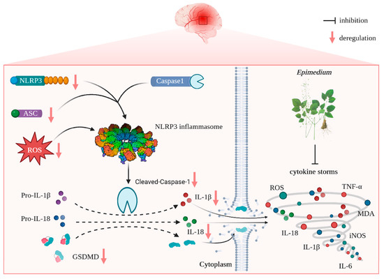 Compelling evidence suggests that apart from neurons, following CIRI, microglia and astrocytes are activated and then elicit excessive inflammatory responses, known as “cytokine storms”, with the promotion of interleukin (IL)-6, IL-1β, and tumor necrosis factor (TNF)-α release [4]. Cytokine storms cause pernicious neuroinflammation on the salvation and recovery of cerebral ischemia, along with the generation of oxidative stress and pyroptosis. Oxidative stress, a disorder in the equilibrium between the generation of reactive oxygen species (ROS, e.g., hydrogen peroxide, superoxide) and antioxidant defenses systems, is elicited during CIRI peculiarly through neuroinflammation, which promotes the generation of excessive reactive oxygen species (ROS) [5]. Pyroptosis is a novel programmed cell death process modulated by Gasdermins (GSDMs) and is also deemed an inflammatory cell death associated with neuroinflammation. Pyroptosis is initiated by the activation of NOD-like receptor 3 (NLRP3), apoptosis-associated speck-like protein containing a caspase activation and recruitment domain (ASC), caspase-1, and GSDMD-N, which controls the cleaving and activation of IL-18 and IL-1β [6]. Recent evidence demonstrates that ROS are considered signal molecules that activate NLRP3, and the ROS/NLRP3/pyroptosis axis plays a vital role in the pathogenesis of CIRI [7]. Thus, targeting the inhibition of the ROS/NLRP3/pyroptosis axis might be a promising therapeutic tactic for CIRI.