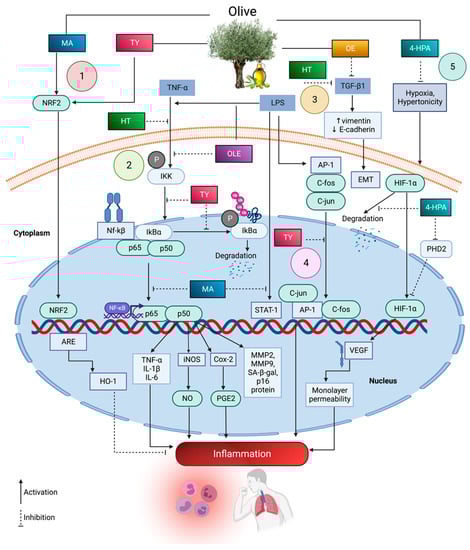 Summary of molecular pathways regulated by olive phytocompounds that modulate respiratory disease inflammation against stimuli in vitro. (1) Upregulation of Nrf2/OH-1 antioxidant pathways by MA and Ty. (2) HT, TY and OLE attenuate TNF-α-induced inflammation and downregulation of NF-κb pathway. LPS or TNF-α activates IKKs and triggers the phosphorylation of inactive IκBα-NF-κb complex. Ty, OLE, HT and MA hinder the ubiquitylation and degradation of phosphorylated IκBα along with the prevention of NF-κb, p50 dimer nuclear translocation and the further activation of target genes for chemokines, cytokines, adhesion molecules, Cox-2/prostaglandin, iNOS/nitric oxide and senescence-associated markers. (3) EMT reversion via the olive extract. (4) Downregulation of AP-1 pathway by attenuating LPS-induced overexpression of c-fos/c-jun dimer by TY. (5) Downregulation of HIF-1 pathway. 4-HPA ameliorates hypoxia and hypertonicity-induced hypoxia-inducible factors; 1 alpha activation by promoting pyruvate dehydrogenase and two dependent hypoxia-inducible factors; 1 alpha degradation and inhibits subsequent vascular endothelial growth factor synthesis and a further increase in monolayer permeability.