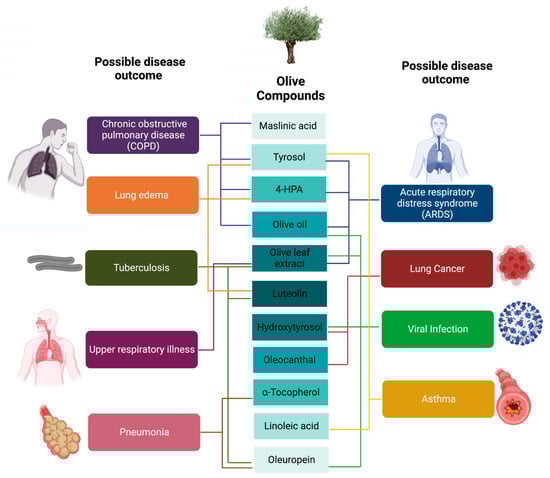 Inflammation, oxidative stress and microbial infections are factors that contribute to the development and progression of respiratory diseases. Inflammation induces lung tissue damage and chronic diseases such as asthma and chronic obstructive pulmonary disease (COPD) [91]. Oxidative stress, on the other hand, contributes to the development of respiratory disorders in addition to the further deterioration of lung tissue. ROS cause damage to DNA, proteins and lipids in the respiratory tract, causing inflammation and tissue damage [92]. This oxidative stress has been linked to the development of respiratory diseases such as COPD, asthma and lung cancer [91,93]. Inflammation induced by microbial infections, such as those caused by bacteria or viruses, contributes to the development of respiratory diseases such as pneumonia and bronchitis [94]. All three factors interact to increase the severity of respiratory diseases and their symptoms. Understanding the intricate relationship between inflammation, oxidative stress and microbial infections can aid in developing new treatments and prevention strategies for respiratory disease. Natural compounds that are enriched with anti-inflammatory, antioxidant and infectious properties could possibly mitigate respiratory disease development. Henceforth, a focus on the olive compounds’ action in respiratory health will be uncovered.