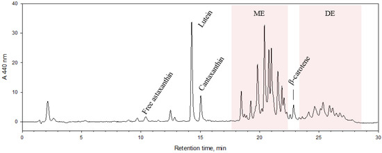 23]. These advantages are particularly important for bioassays and for chemical identification. The CCC platform used in this study served as a chromatographic preparative tool to support bioassays. It is clear that further research is needed to develop more selective CCC methods aimed at isolating the individual astaxanthin monoesters and diesters and the other carotenoids present in EXT to determine their contribution to the observed effect of EXT and for potential commercial application. According to [