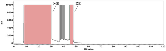 23]. The target fractions were collected manually and evaporated at 30 °C under reduced pressure, yielding 1.5 g ME and 0.1 g DE, which were subsequently analyzed using HPLC-DAD.
