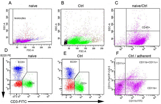 In each experiment, the proportions of splenocyte subpopulations (lymphoid and myeloid lineages) were evaluated by flow cytometry after 24 h of incubation (3 × 106/3 mL/well) in CM at 37 °C and 5% of CO2 in a six-well plate. Nonadherent cells were collected and counted, while adherent cells were first detached by incubation in warm Accutase solution at 37 °C for 15–20 min, followed by gentle scraping with a cell scrapper and washing with PBS. Cell samples (0.4 × 106/sample) of naïve splenocytes and pooled nonadherent and adherent subpopulations after 24 h of incubation were stained with anti-mouse monoclonal antibodies to CD 45.2 (PE-Cyanine7, clone 104, eBioscience, San Diego, CA, USA), CD3 (PerCPeFluor710, clone 17A2, eBioscience, USA), CD45.R (B220, APC), and (clone RA3-6B2, eBioscience). The other samples were stained with anti-mouse antibodies against CD11c (PerCP Cyanine 5.5, clone N418, eBioscience, USA) and CD11b (FITC, clone M1/70, BioLegend, USA). Cells were stained with the antibodies for 30 min at room temperature and in the dark, washed and analyzed by flow cytometry. Phenotypic analysis was performed using a FACS Canto cell analyzer (Becton Dickinson Biosciences, Franklin Lakes, NJ, USA). The acquired data were analyzed using FACS Diva software.