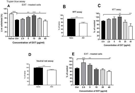 In trypan blue and MTT assays, co-culture with concentrations of EXT up to 10 µg/mL prevented a significant decrease in cell viability; however, transport of the neutral red dye across membranes was inhibited at concentrations up to 5 µg/mL. In contrast, a decrease in cell viability was observed at a concentration of 40 µg/mL in all three assays. Immune cells are particularly sensitive to oxidative stress because of a high content of polyunsaturated fatty acids in their plasma membranes [